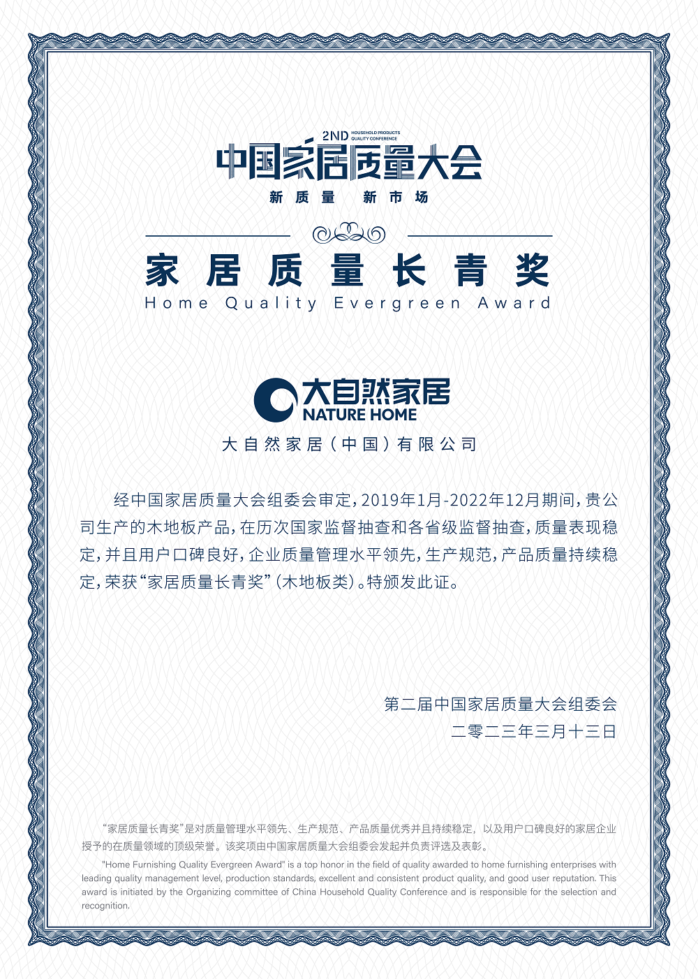 2023年3月13日,在3·15消費者權(quán)益日來臨之際,沸騰質(zhì)量數(shù)據(jù)聯(lián)合紅星美凱龍,以及家居相關(guān)行業(yè)協(xié)會、質(zhì)檢/認(rèn)證機(jī)構(gòu)、家居品牌企業(yè)、家居上下游產(chǎn)業(yè)鏈企業(yè)、集采平臺、主流媒體等,以“新質(zhì)量 新市場”為主題,重磅舉辦《第二屆中國家居質(zhì)量大會》。在此次重量級活動上,大自然家居榮獲“家居質(zhì)量長青獎”,產(chǎn)品金風(fēng)玉露地板獲得“沸騰質(zhì)量金獎”,再次向業(yè)內(nèi)人士和消費者展現(xiàn)了自己的產(chǎn)品質(zhì)量。
